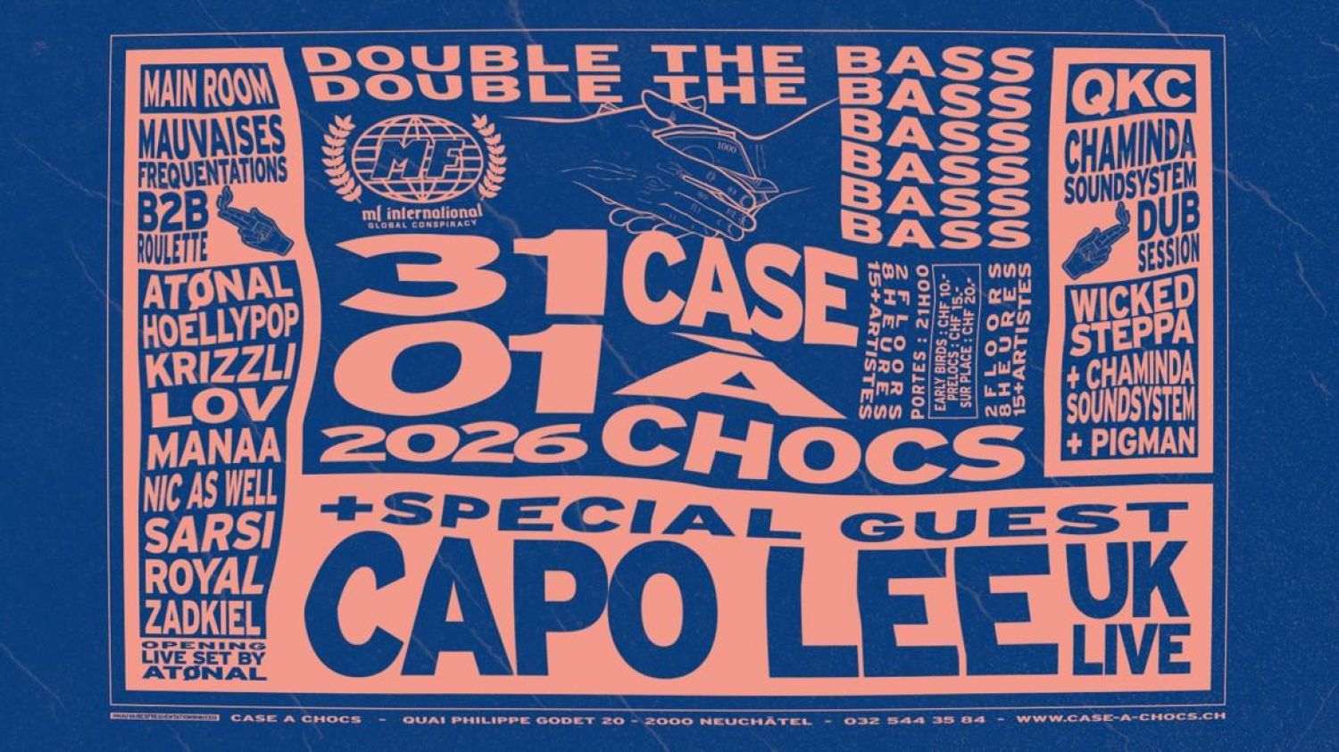 Les groupuscules neuchâtelois Mauvaises Fréquentations et Chaminda Soundsystem s’associent samedi 31 janvier 2026 pour une soirée combo chargée en basses. Dans la grande salle, 9 DJs se prêteront au jeu du B2B Roulette à travers 4 slots tirés au sort; sans savoir ni avec qui, ni à quelle heure iels joueront. Au club, Chaminda Soundsystem feront trembler les murs pour une grosse Dub Session en présence de Wicked Steppa. Deux lives viendront agrémenter ce programme avec Atønal en ouverture et la légende grime Capo Lee, venu spécialement de Londres pour l’événement.