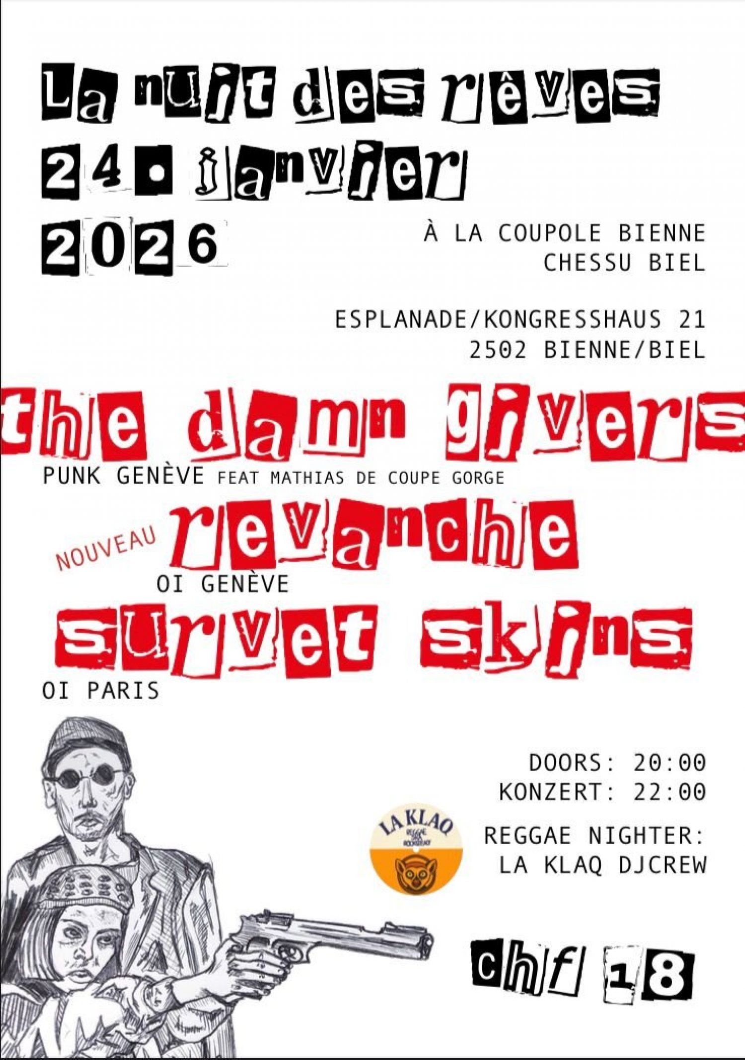 Survet Skins Oi de Paris https://youtu.be/VyOAR1fVD9c?si=uQgeiJS-gpFjTimnThe Damn Givers Punk de Genève https://youtu.be/ZC8xq2G2WLE?si=Bkp5BZlEiyc8EVFE