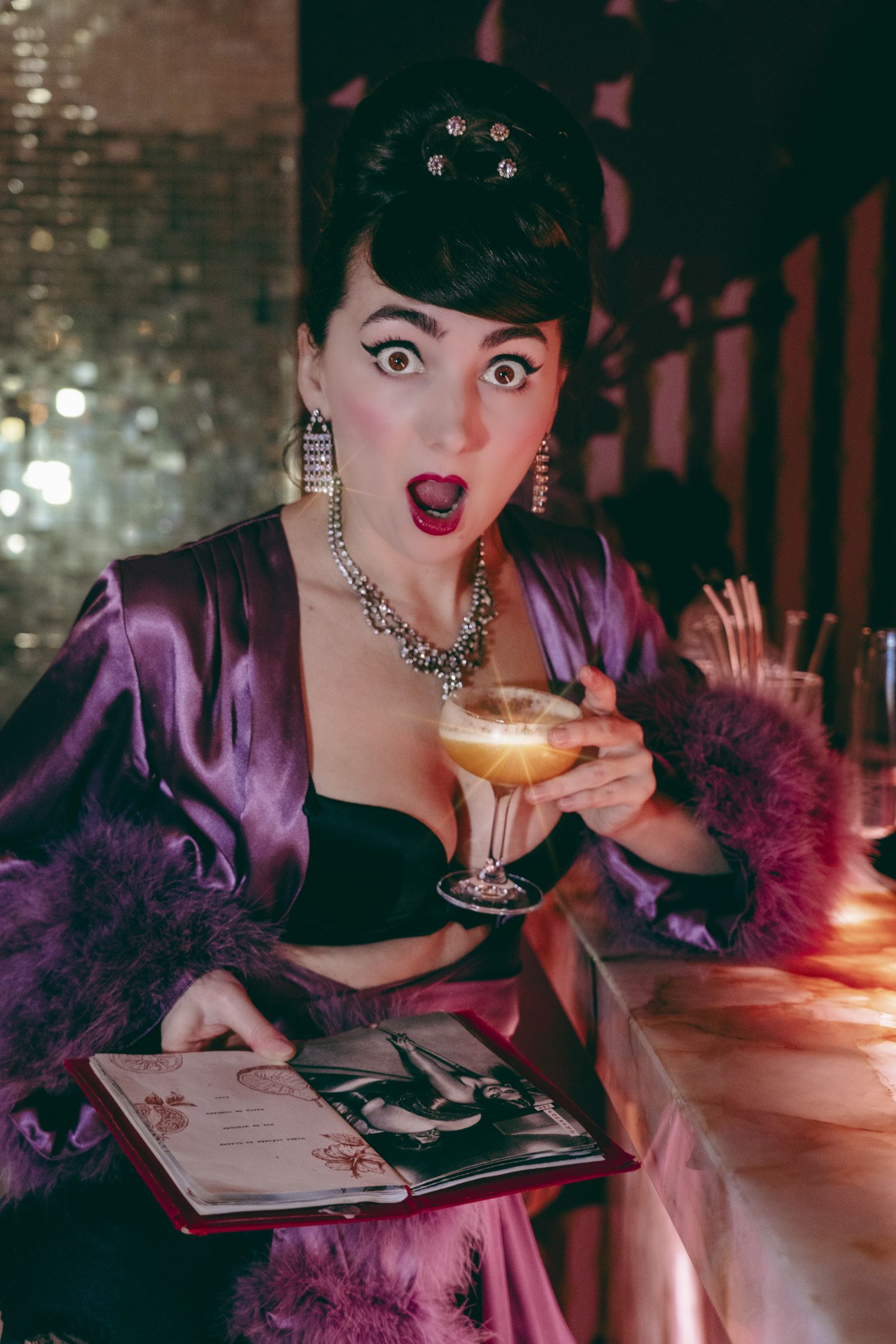 Pour célébrer ce passage sur scène, nous avons l’immense plaisir d’être accompagnés par Sucre d’Orge, figure parisienne du strip-tease rétro. Artiste incontournable de la scène burlesque, elle incarne un univers chic, pétillant, poétique et délicieusement coquin.