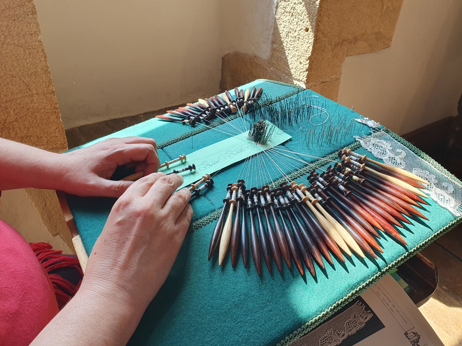 La dentelle aux fuseaux se construit fil après fil. Les fuseaux en bois maintiennent la tension. Les épingles fixent le motif sur un coussin. Le dessin apparaît progressivement.