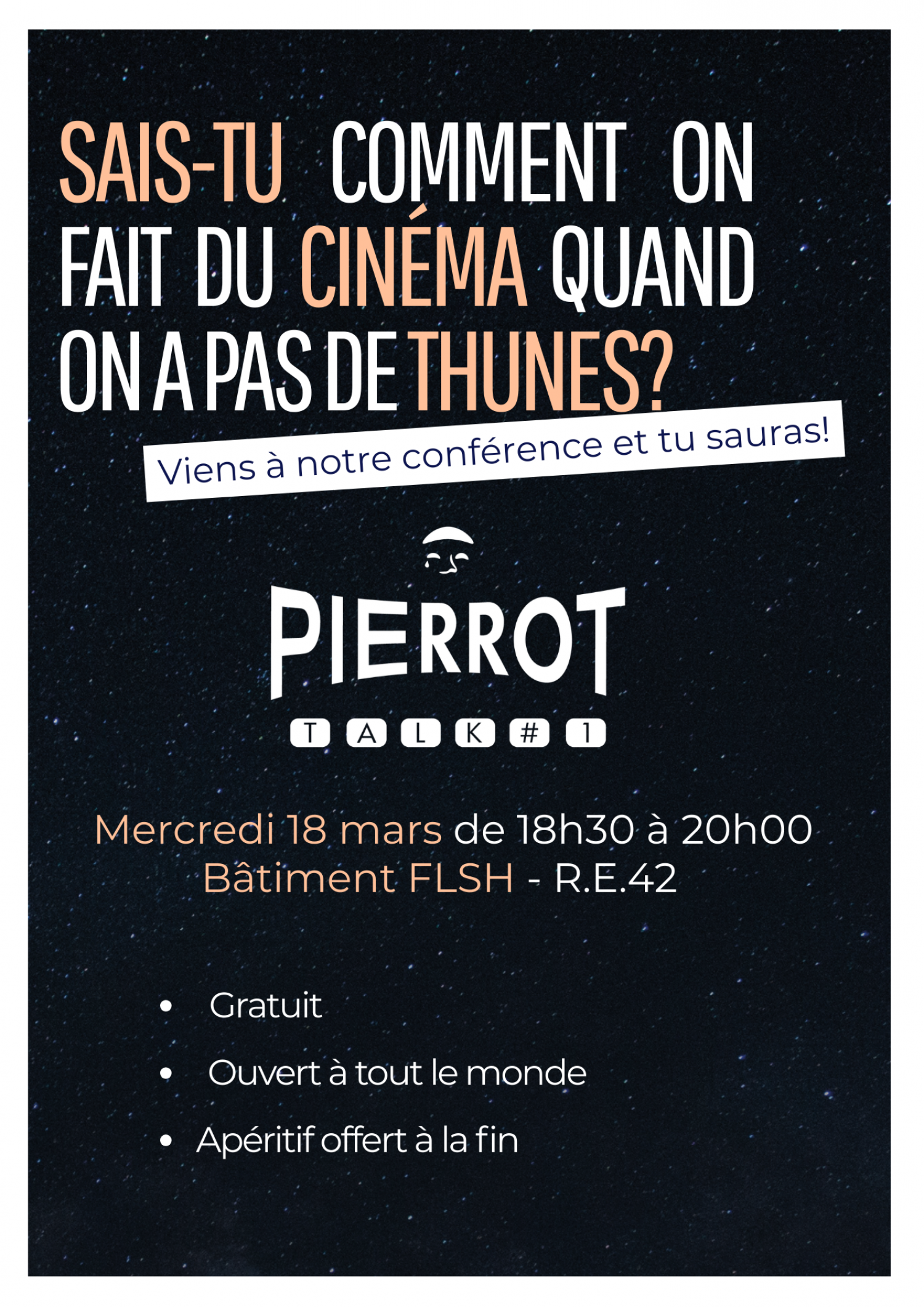 La première conférence se tiendra mercredi 18 mars, de 18h30 à 20h00 dans la salle R.E.42 de l’Institut FLSH, sur le thème « faire du cinéma sans thunes ».