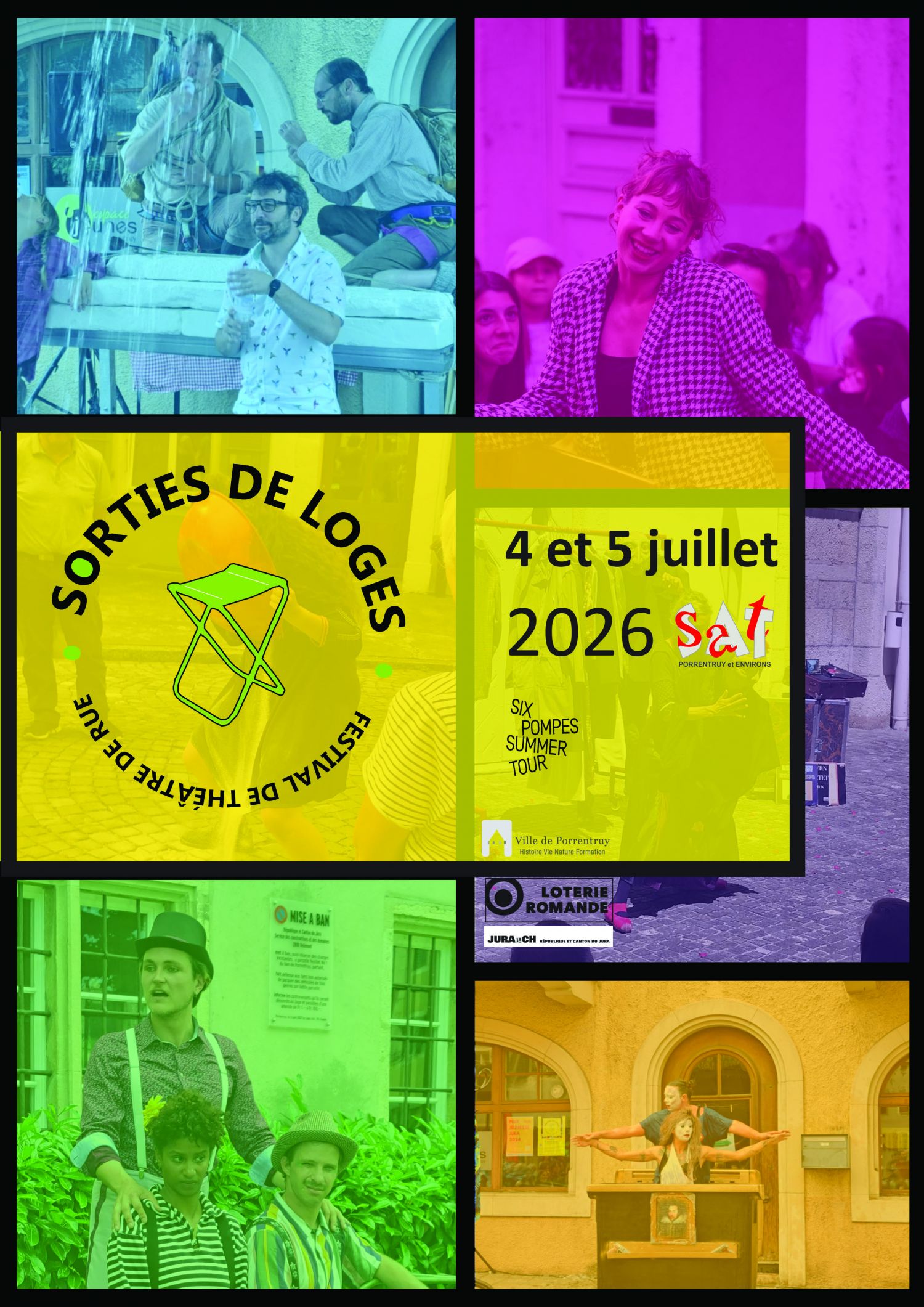 Pour cette édition anniversaire, Sorties de Loges accueillera cinq compagnies qui présenterons sept spectacles différents sur deux jours. Retrouvez-nous à Porrentruy. Prenez vos chapeaux et vos pliants! Un cadre idéal, une guinguette agréable, des spectacles sur deux jours pour petits et grands. Visiter notre site internet pour plus d'information.